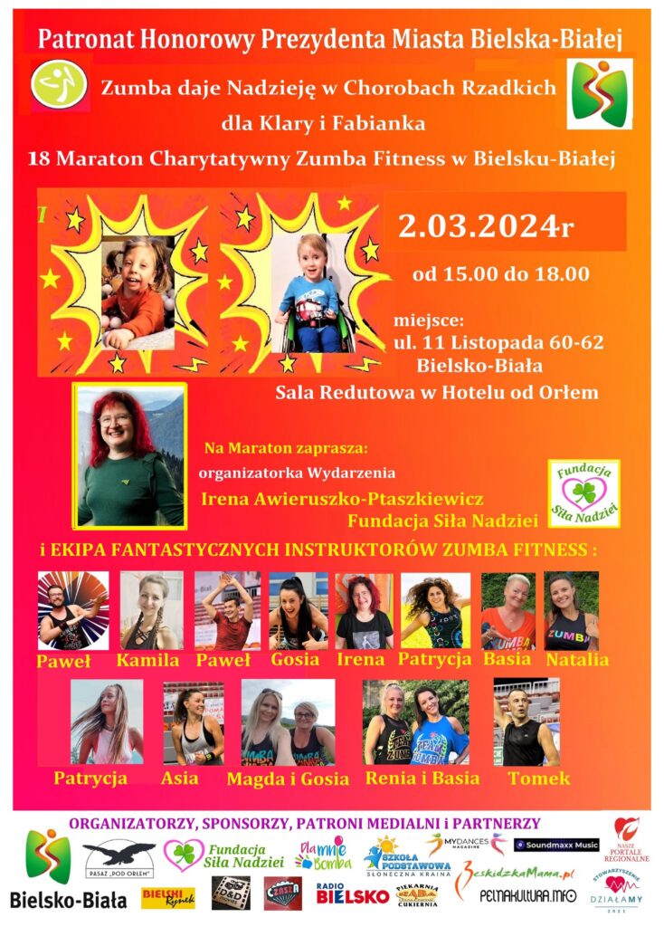 Za nami przepiękne wydarzenie: Zumba daje Nadzieję w Chorobach Rzadkich dla Klary i Fabianka -18 Maraton Charytatywny Zumby w BB w bajkowej Sali Redutowej w Hotelu pod Orłem w Bielsku-Białej. Jego organizatorką jest niezastąpiona Irena Awieruszko-Ptaszkiewicz, która po raz 18-sty wspólnie ze skupioną wokół niej społecznością taneczną Zumba Fitness okazała serce najbardziej potrzebującym naszej pomocy. I chociaż to spektakularne wydarzenie jest już za nami teraz również my, mamy szansę pomóc wpłacając datki na rzecz Klary i Fabianka!
